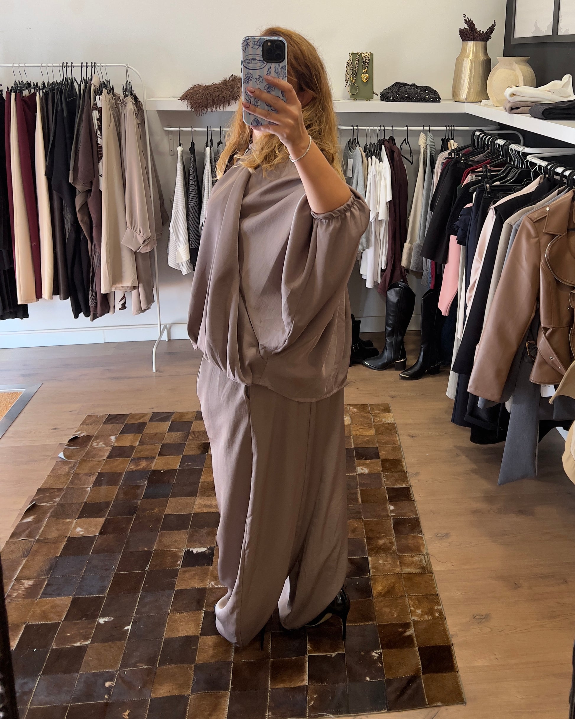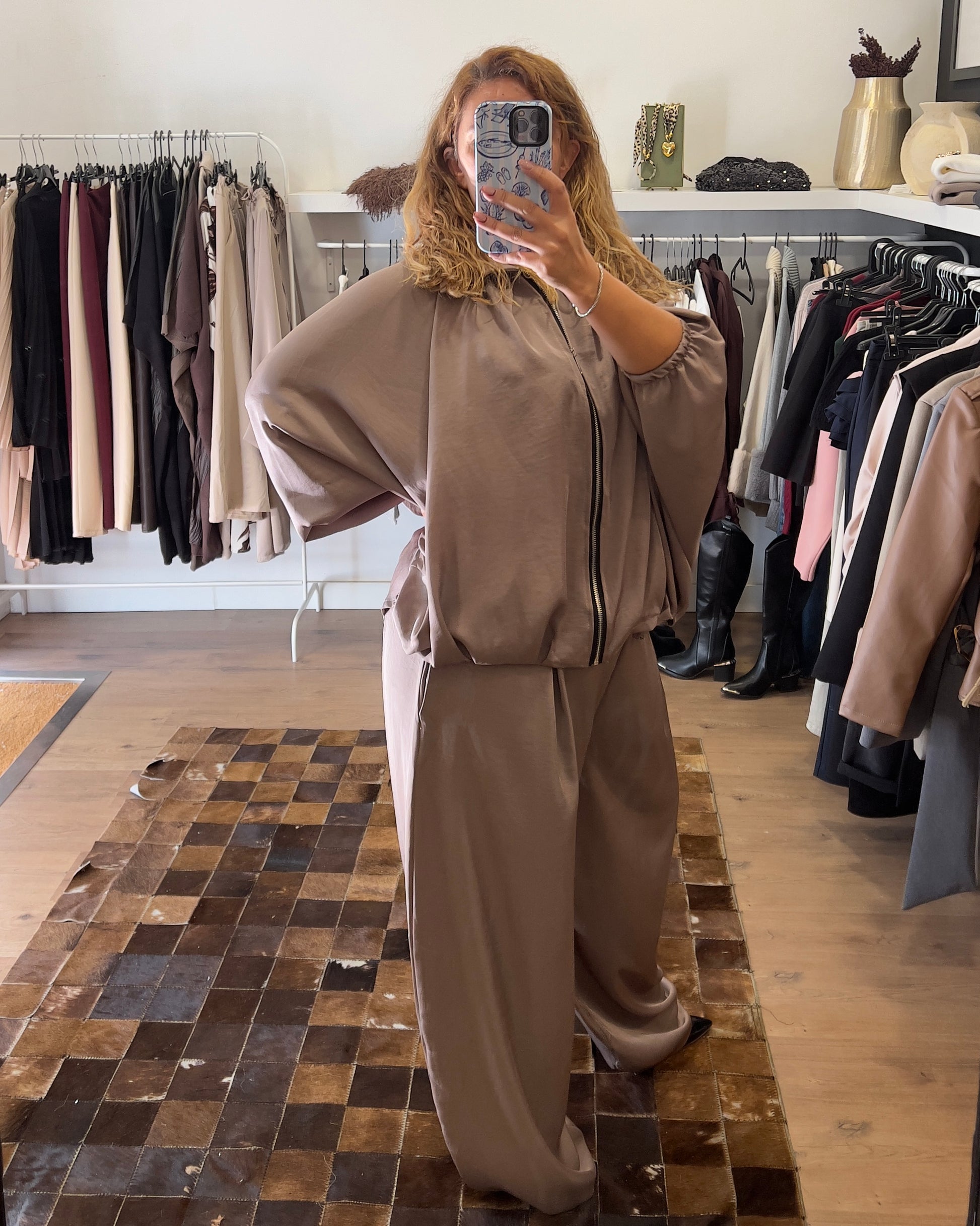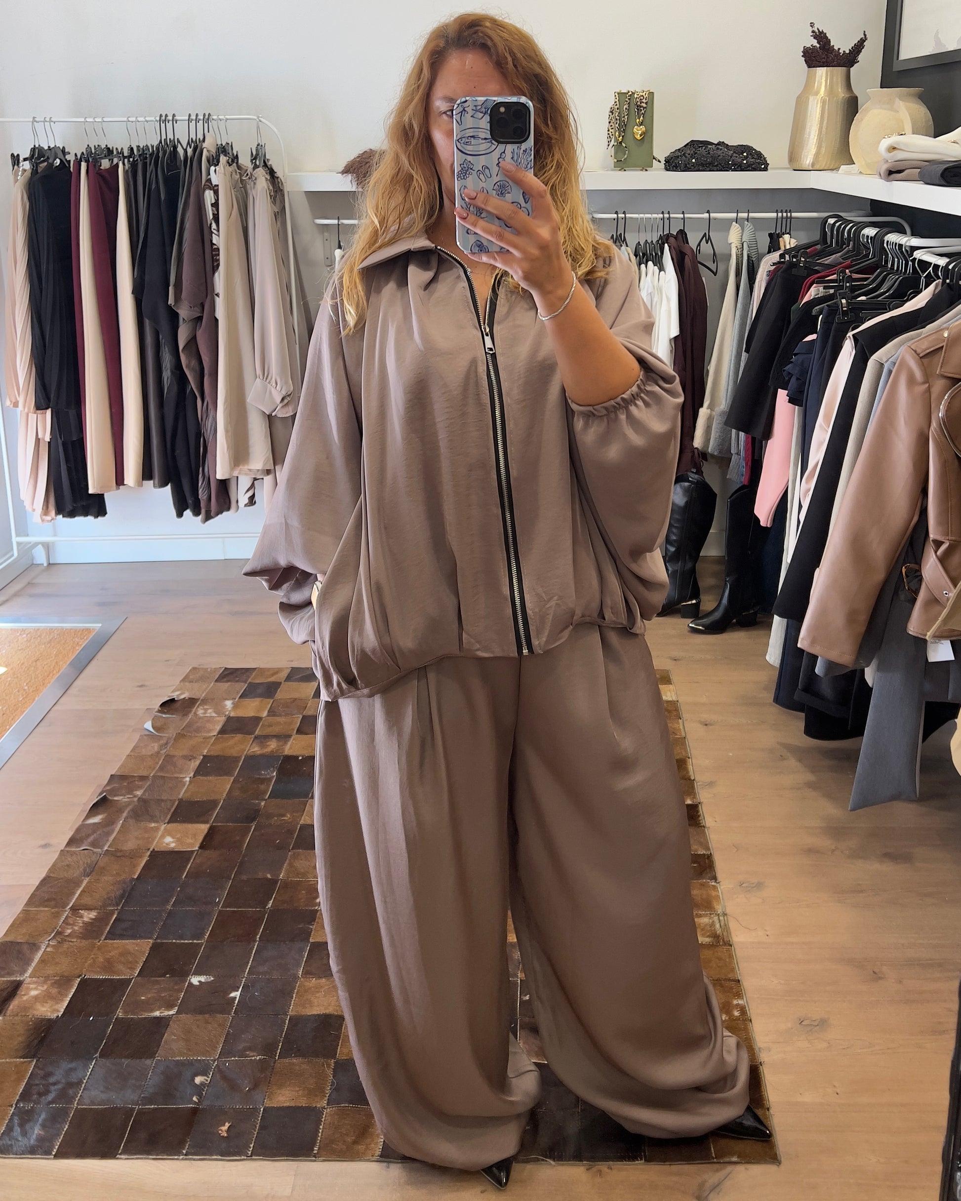 Conjunto abalonado, composto por casaco e calça plantalona. O casaco é abalonado e a calça faz o mesmo efeito. Ambas as peças em tecido acetinados. Ótimo para um look arrojado e chique.